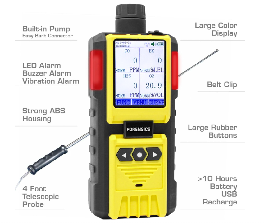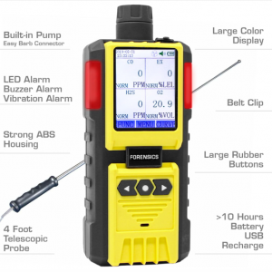 Este es nuestro mejor detector multigás industrial de 4 gases. El monitor de 4 gases cuenta con una bomba integrada que permite una respuesta del sensor extremadamente rápida y muestreo puntual o continuo para confirmar la calidad del aire, la toxicidad y la seguridad antes de ingresar a espacios confinados. Es una unidad extremadamente robusta para la protección personal, ideal para la seguridad laboral y ocupacional. Este monitor detecta CO, H2S, O2 y LEL. Incorpora un microprocesador de 32 bits, pantalla LCD a color y funciones de visualización gráfica.
